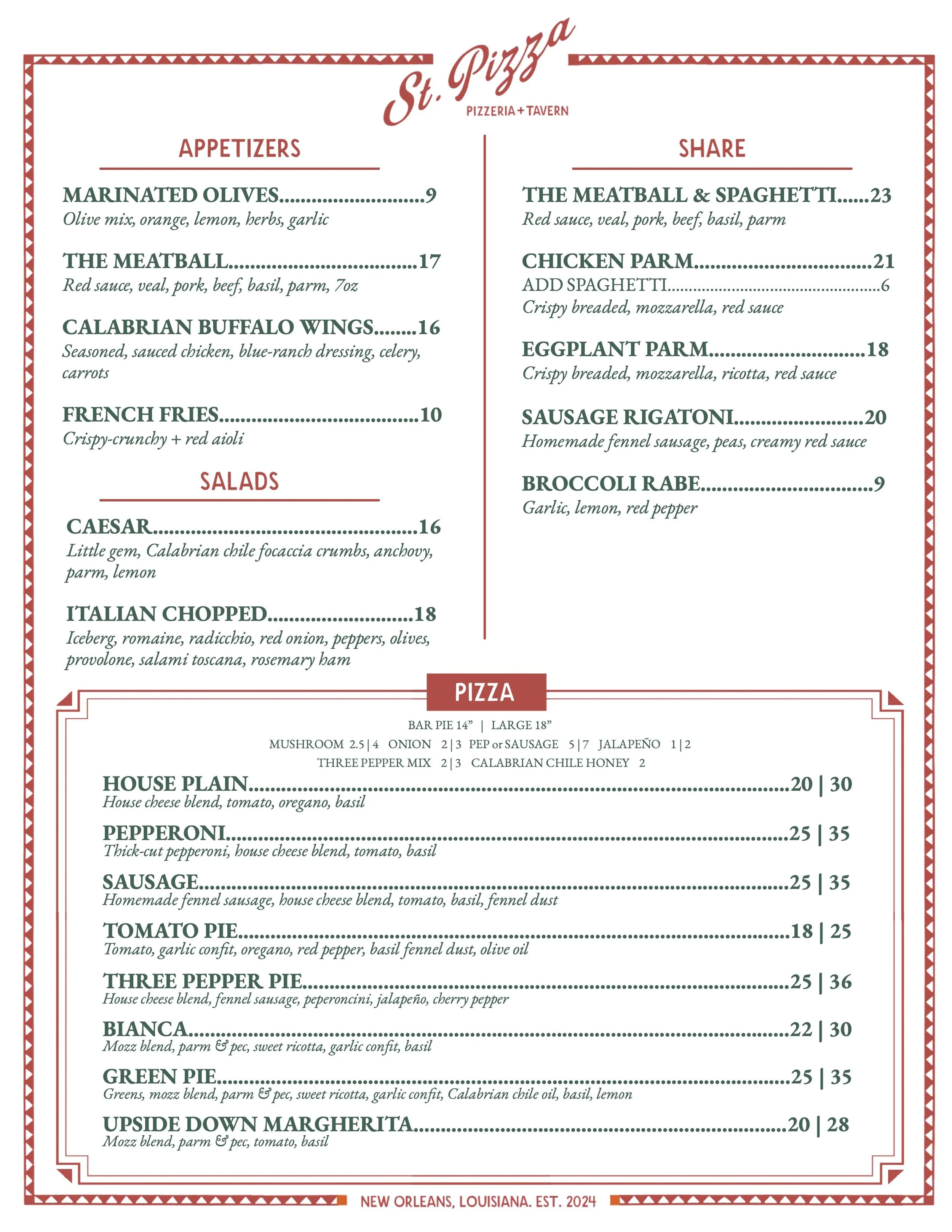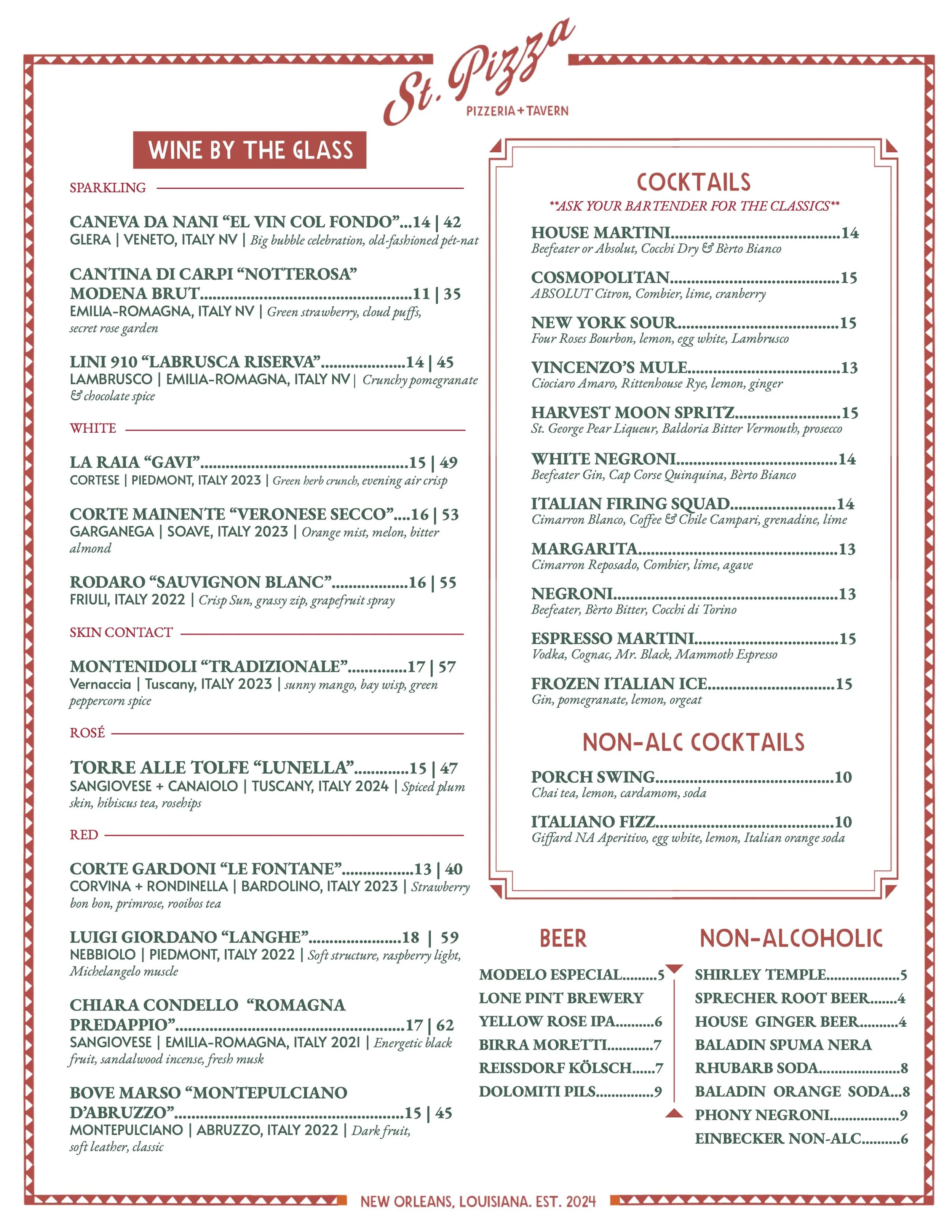 St. Pizza is a pizzeria + tavern in the Lower Garden District dreamed up by Tony Biancosino, a Princeton, New Jersey and Bucks County, PA native. He grew up in a big Italian-American family cooking and eating in their restaurant, homes, and up and down the East Coast. In 2023, he opened St. Pizza with New Orleans native Abhi Bhansali and his wife and partner Leslie Pariseau in 2023 (auspiciously during Mardi Gras). Leslie and Tony own Patron Saint, St. Pizza’s sibling wine shop and bar just next door where you can find wine by the glass + bottle, snacks, gifts & more.