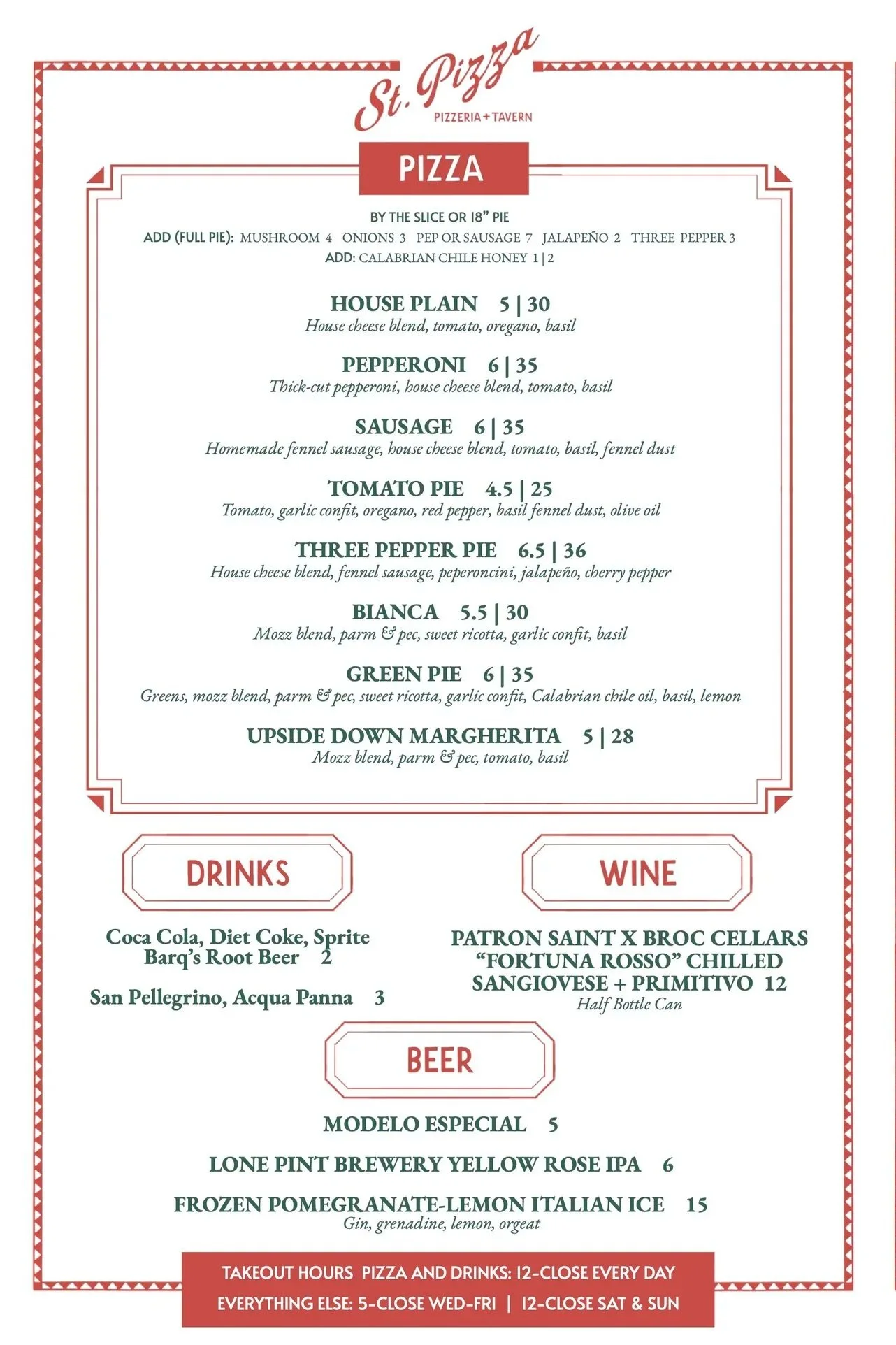 HOW DOES ORDERING WORK? All to-go orders are taken at the pizza window. To-go orders are for takeout only. You are welcome to eat at our little slice counter, outside at our tables, or at our sibling wine shop + bar Patron Saint, right next door.